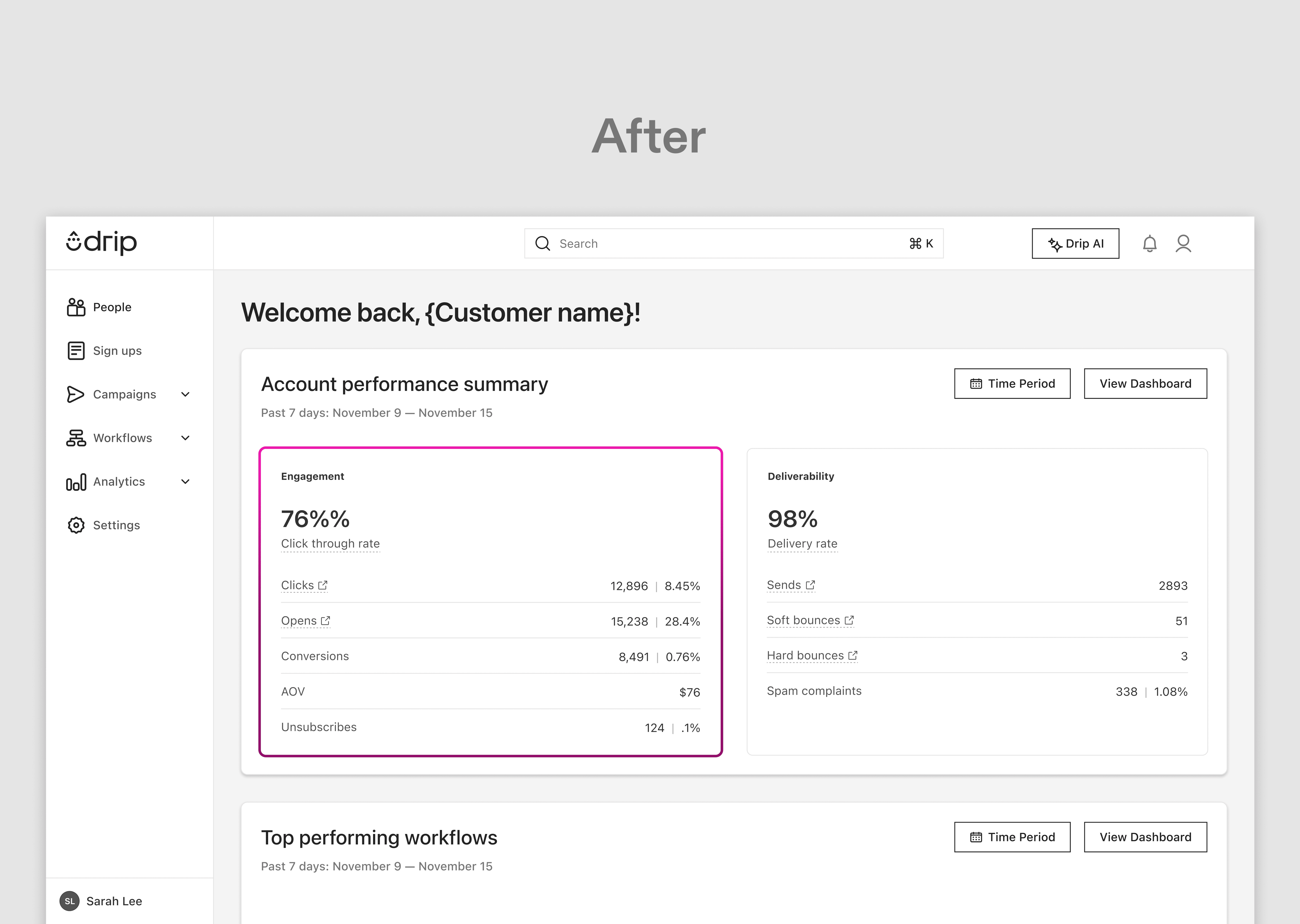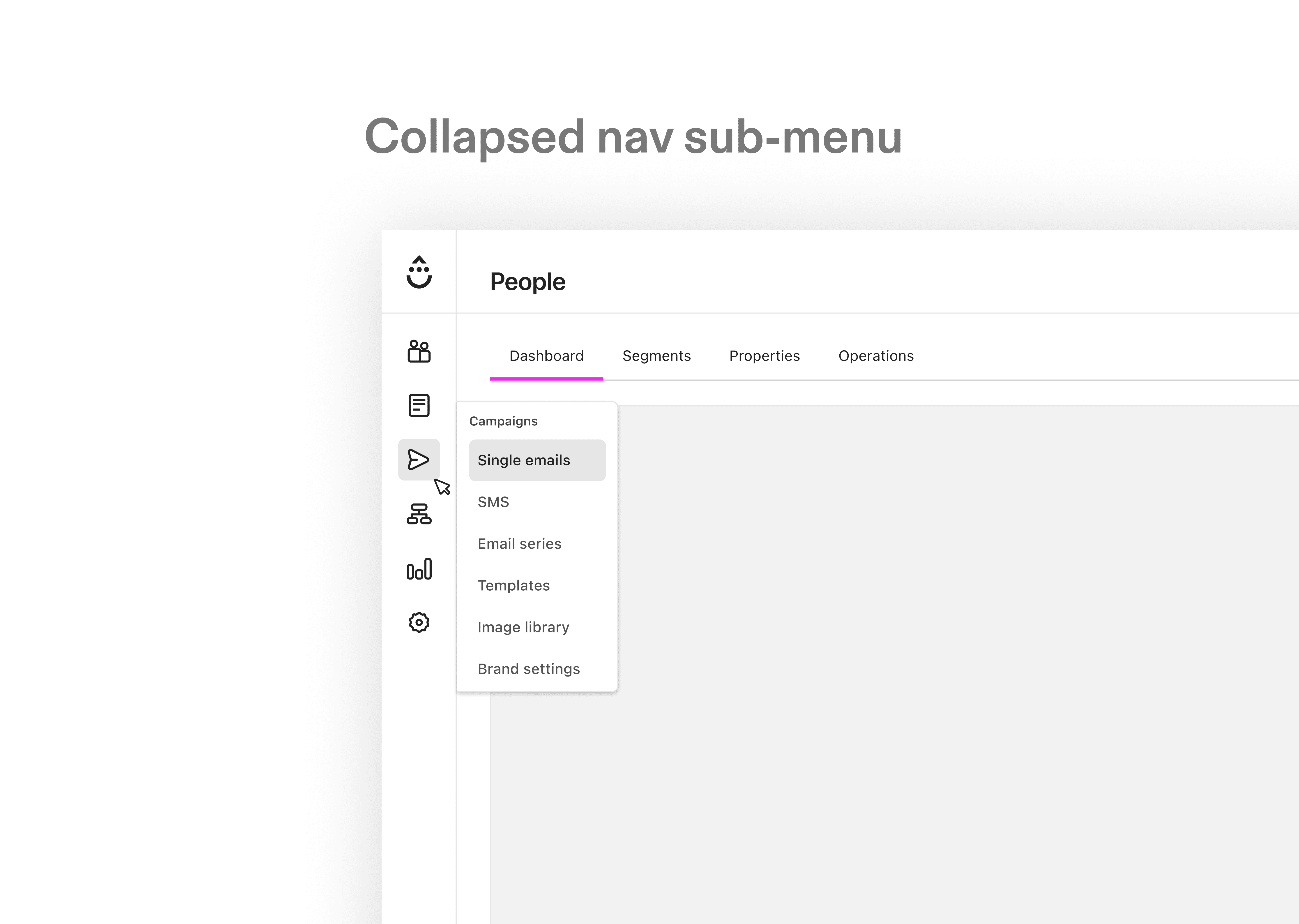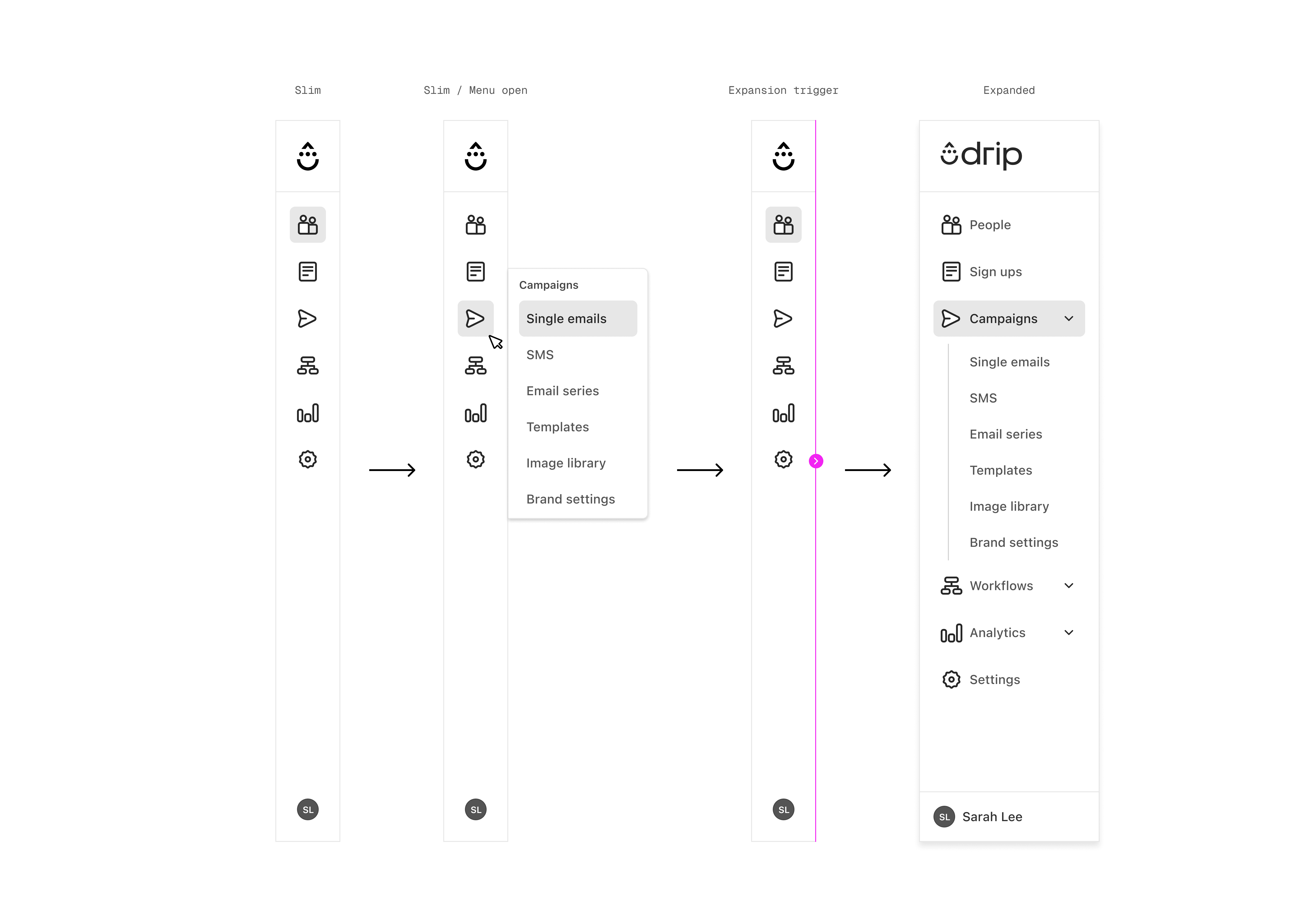 In parallel, the primary navigation was restructured with cleaner spacing, simplified groupings, and collapsible menus for content-dense areas such as Campaigns and Workflows, resulting in a more predictable and scannable navigation experience.