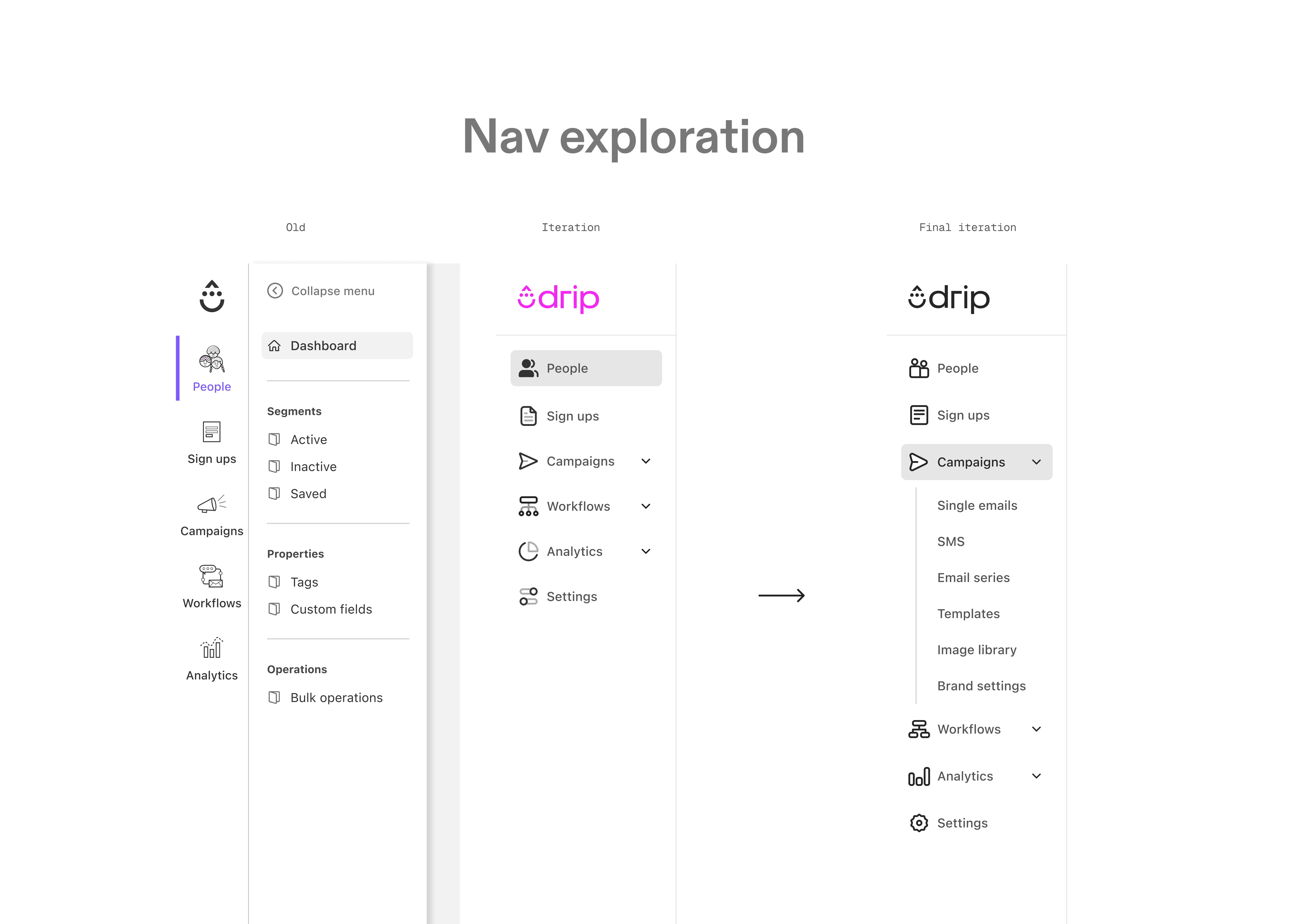 To address the fragmentation in Drip’s navigation and page headers, we began with a comprehensive audit of the existing navigation patterns and iconography to understand where inconsistencies and visual noise were occurring across the product.