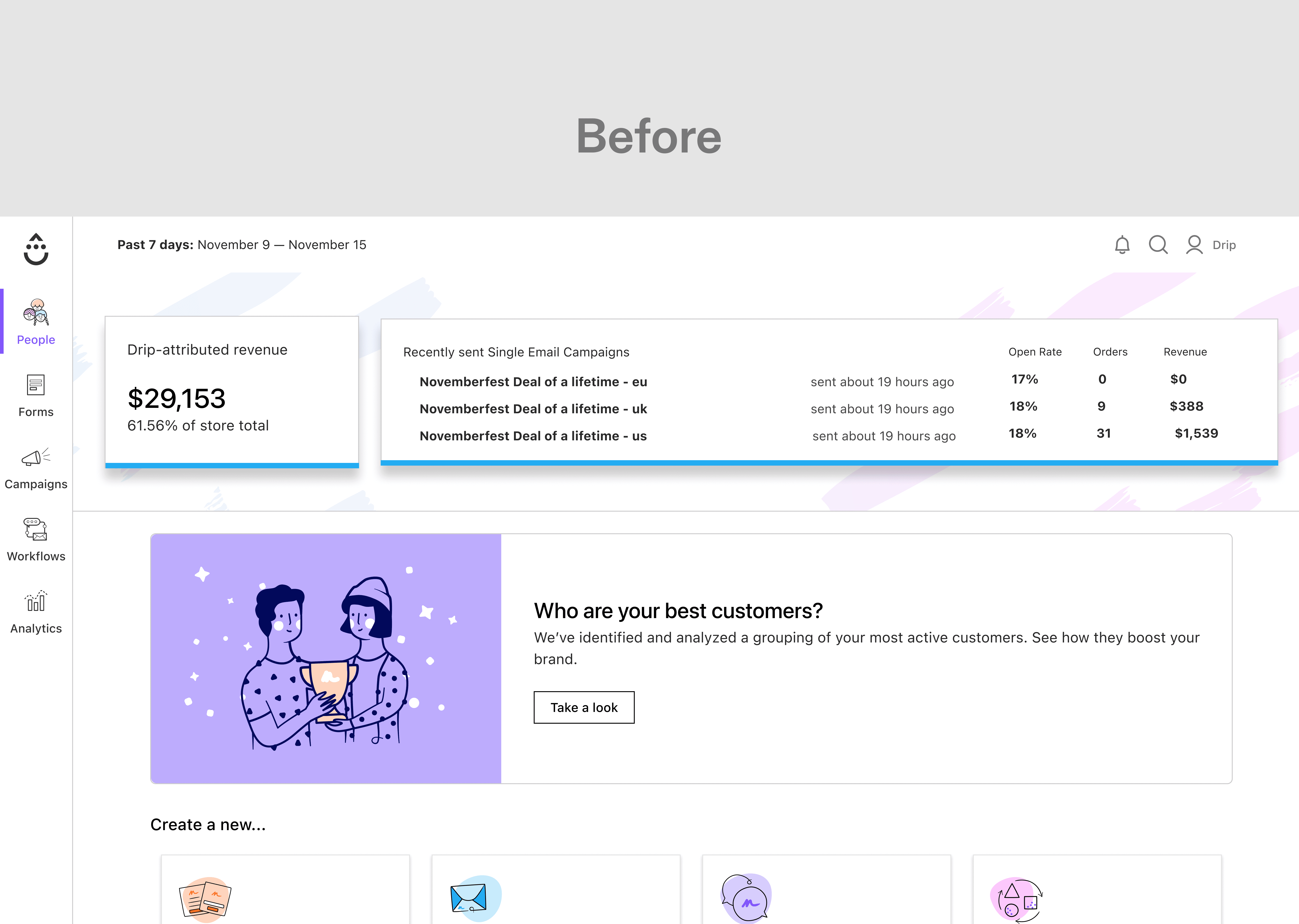 As Drip’s product expanded, its navigation and page header system became increasingly fragmented, creating an interface that felt cluttered, inconsistent, and harder to understand than the underlying product actually was.