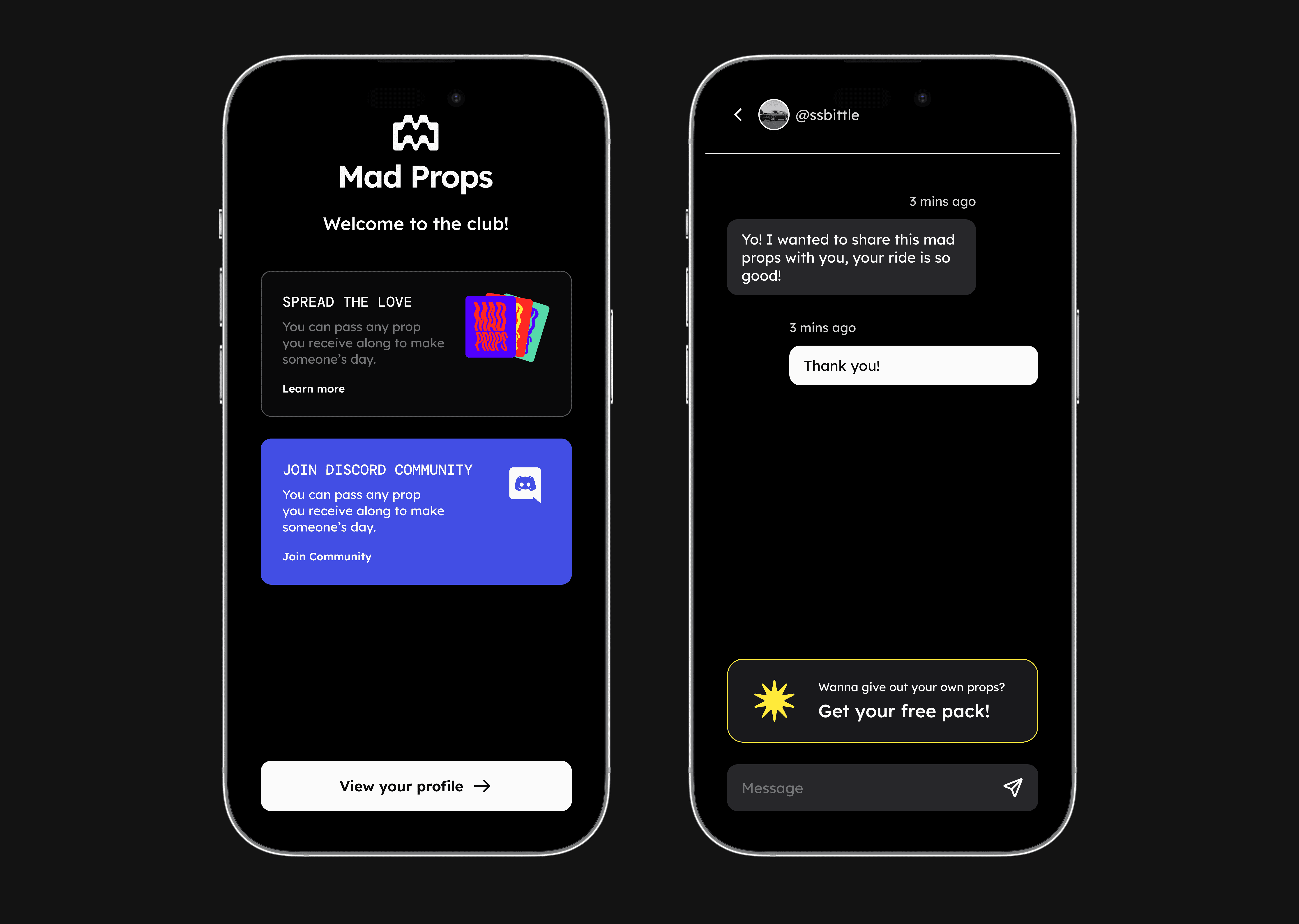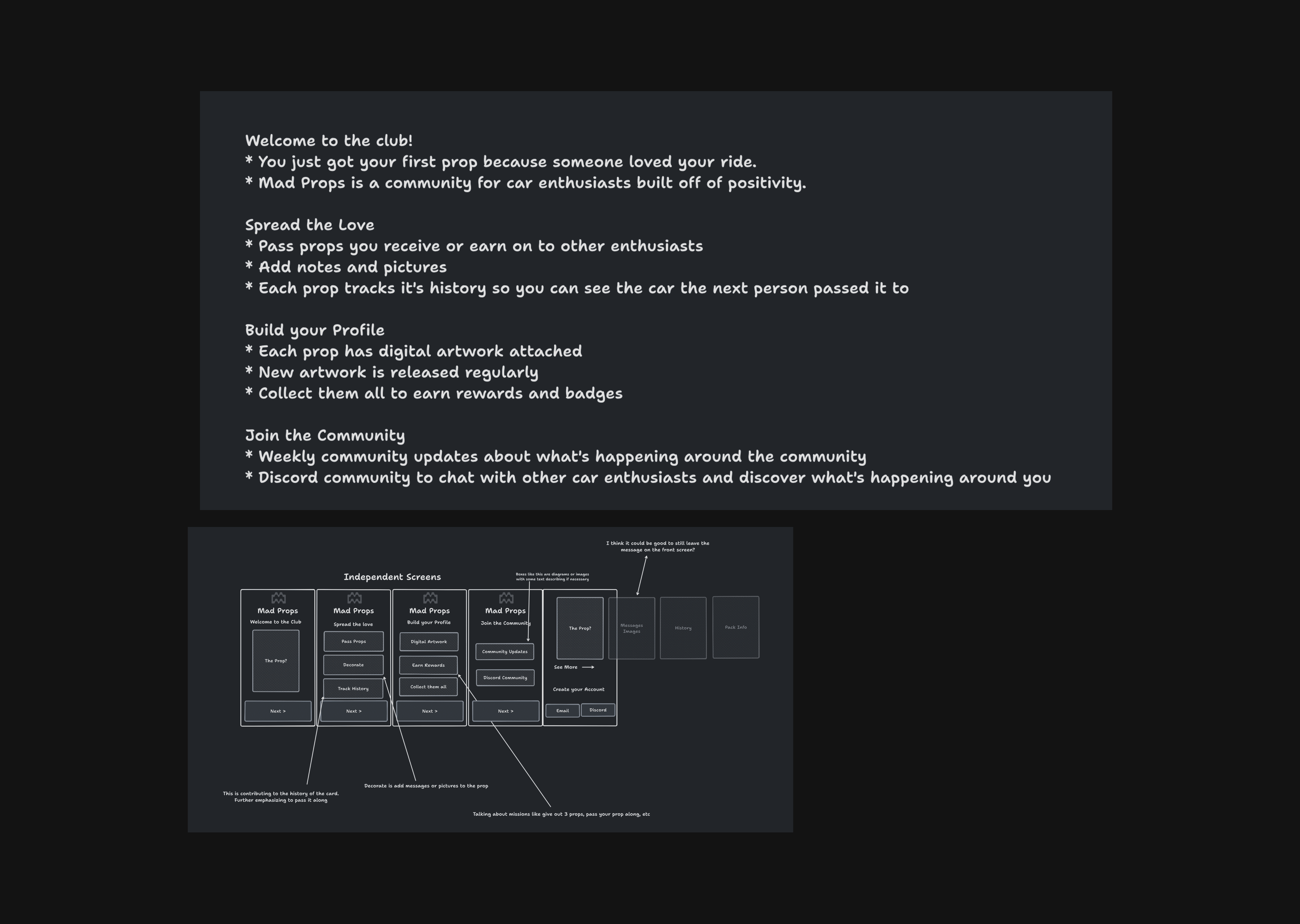 As lead designer, working alongside an engineer and a brand designer, I helped shape Mad Props Club into a physical-digital experience that makes those moments count. By pairing a mobile app with uniquely designed prop cards, we created a simple way to give recognition on the spot — whether by scanning a card or leaving it behind — and turn fleeting encounters into ongoing connections within a growing, niche car community.